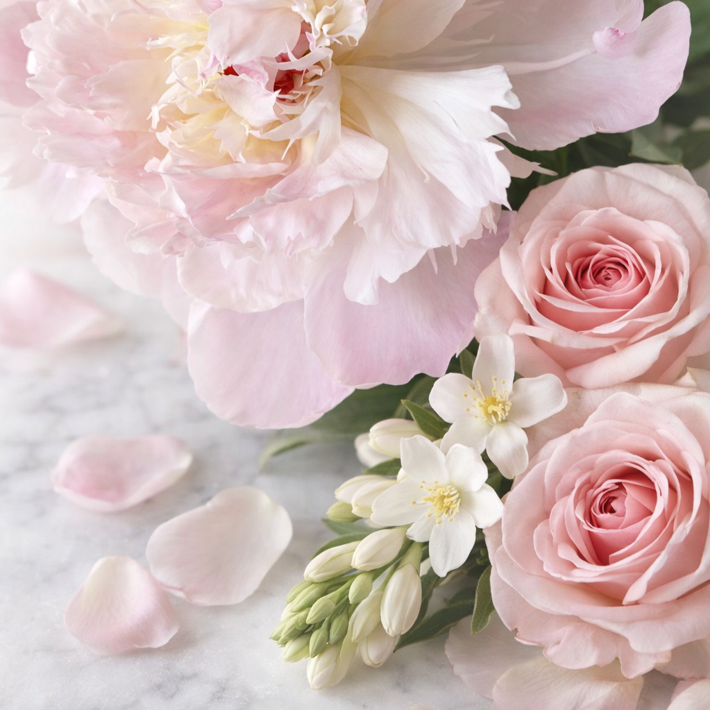 ROSII opens like a bouquet resting on marble — lush white florals and fresh rose petals wrapped in delicate warmth. It’s elegant, graceful, and deeply feminine.